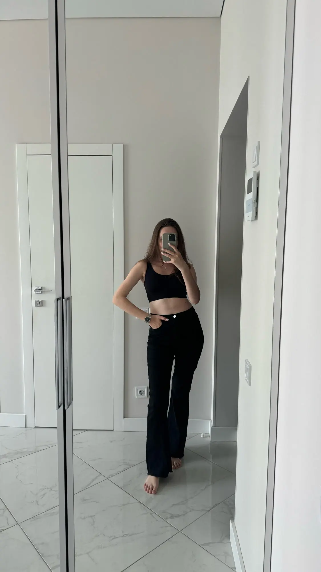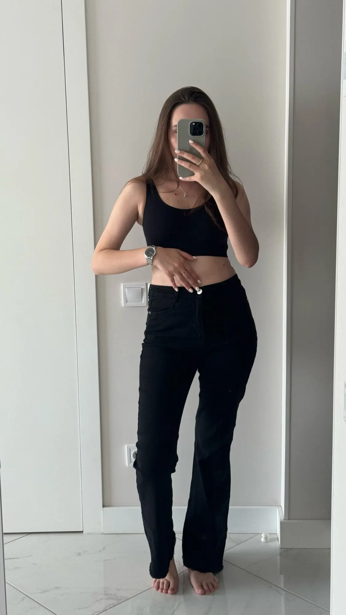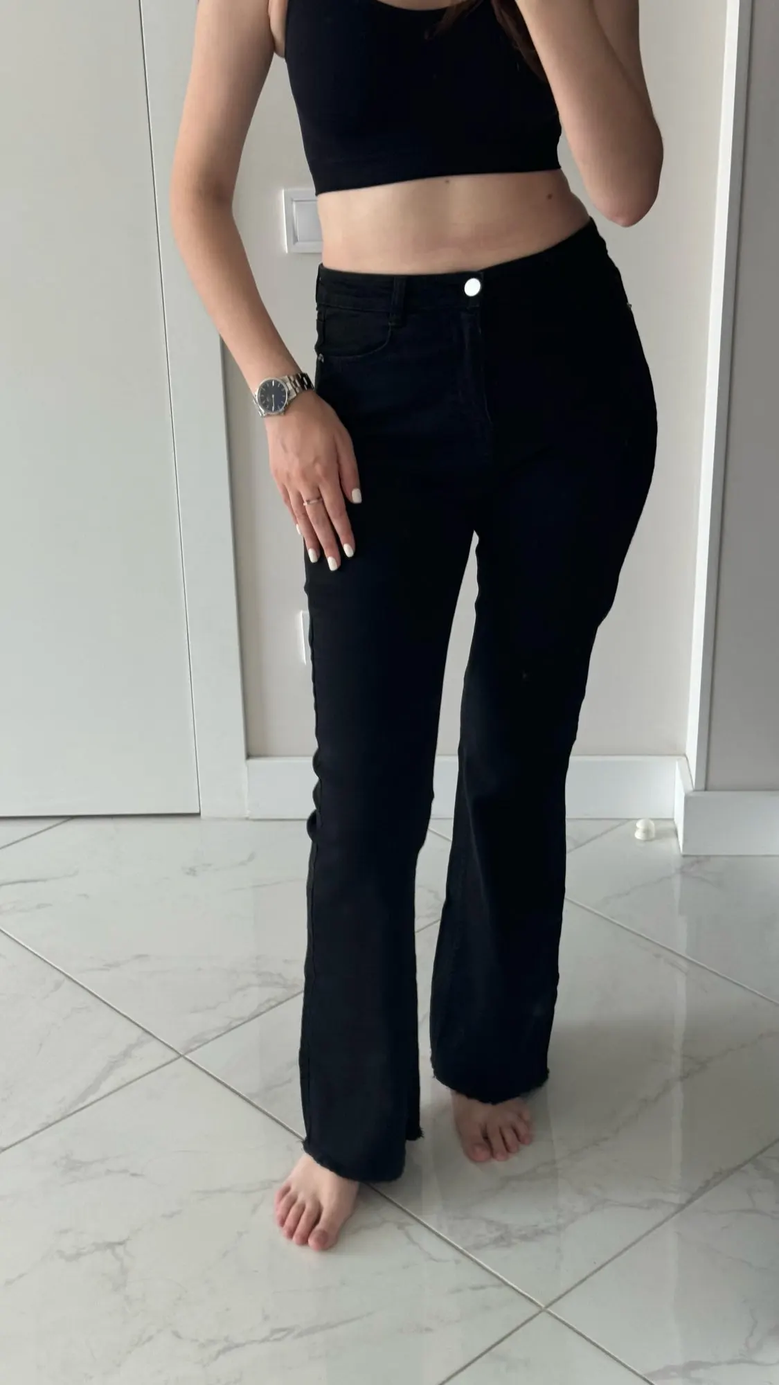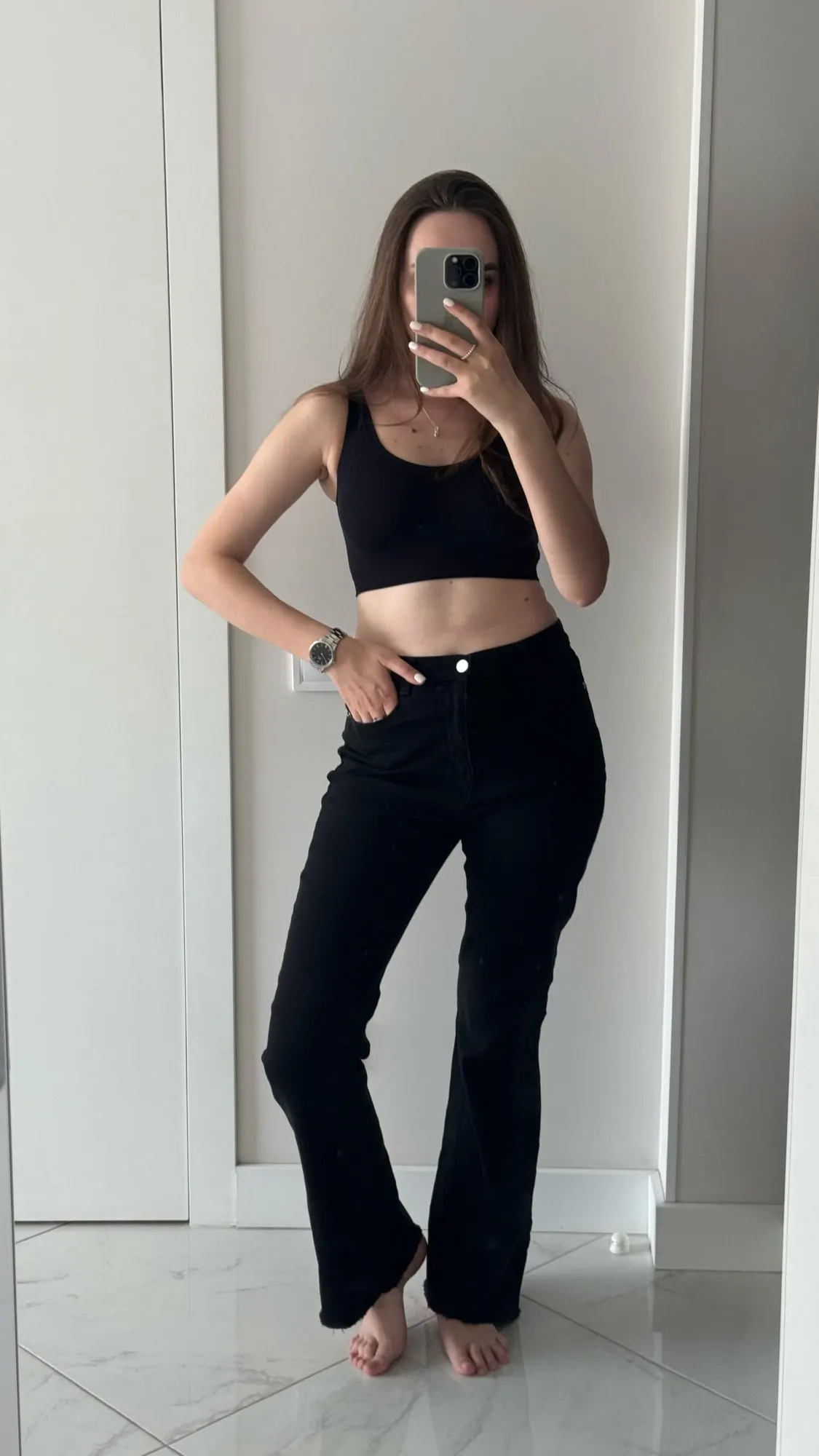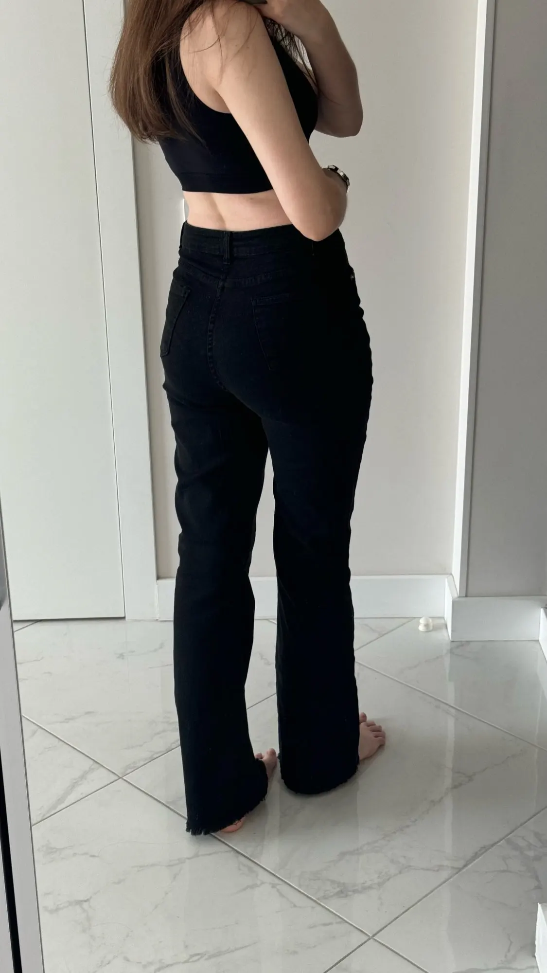 Cool jeans, they stretch very well, feel pleasant against the skin, and don't squeeze anywhere. My waist measurements are 64 cm, hips 94 cm, height 165 cm. The quality is excellent. The basic black color will match everything. I wear it with pleasure! Delivery to Kyiv in 2 weeks!